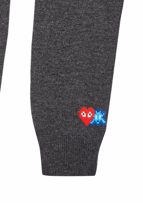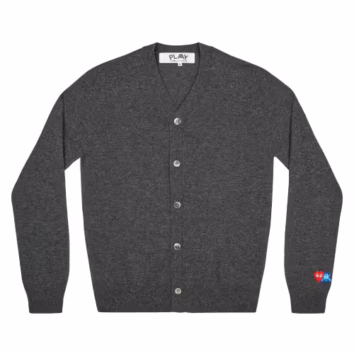 CDG PLAY V-Neck Cardigan Invader Red Heart and Blue Emblem (Grey)