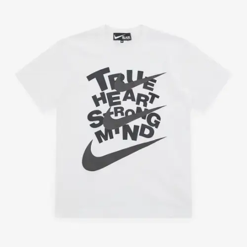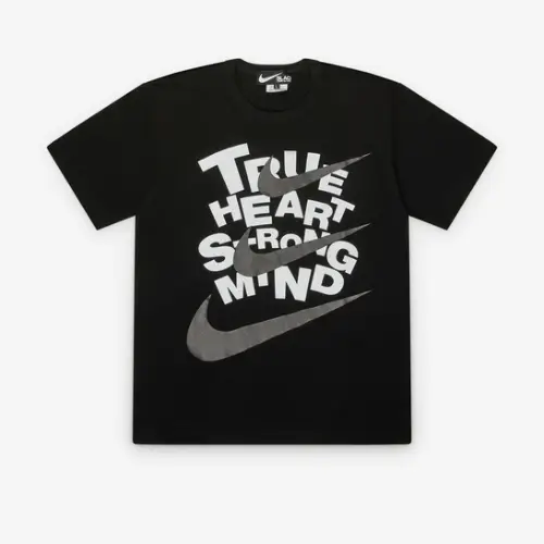 Elevate your streetwear game with the Comme des Garçons Nike True Heart T-Shirt, a fusion of avant-garde Japanese design and iconic athletic style. This premium tee embodies both comfort and statement-making aesthetics, making it a must-have for fashion enthusiasts and sneakerheads alike. Crafted with meticulous attention to detail, the shirt features a classic crew neckline and a relaxed fit, ensuring effortless layering or standalone wear.
